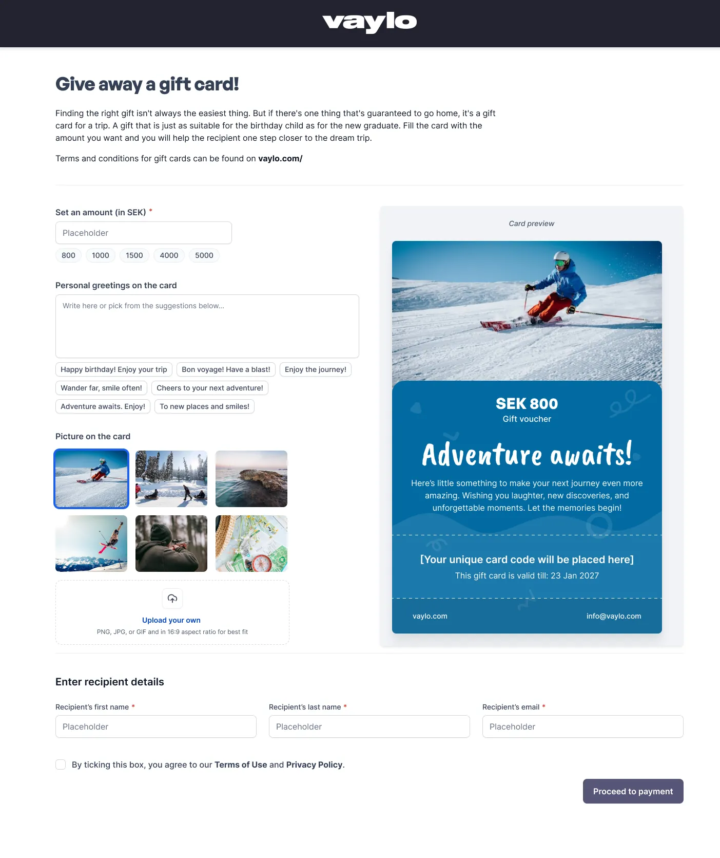 Vaylos presentkortslösning är fullt integrerad i bokningssystemet och eliminerar behovet av dyra tredjepartsleverantörer. Detta ger er en snabb och enkel lösning för att omedelbart börja sälja digitala presentkort, med full kontroll över design, försäljning och ekonomi.